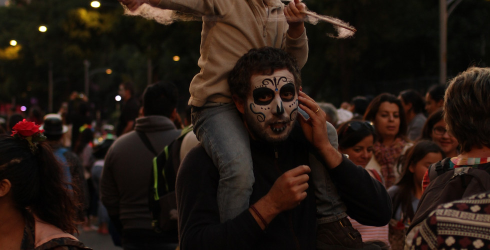 Dans les rues, on ne compte plus le nombre de stands de maquillages improvisés sur les trottoirs. On fait comme tout le monde : on attend notre tour pour nous transformer en squelette fleuri ! Le soir venu, tout Mexico se retrouve au pied del Angel de la Independencia, prêt pour défiler. Que la fête commence !